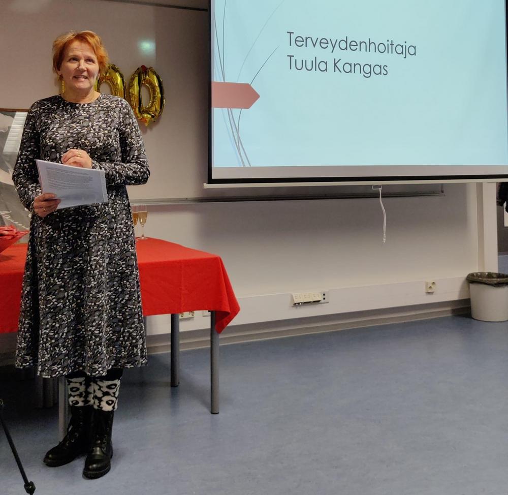 Terveydenhoitajaliiton alkutervehdyksen toi Terveydenhoitajaliiton puheenjohtaja Kirsi Grym ja tietysti juhlassa nostettiin malja meän 100-vuotiaalle koulutuksellemme. Puheiden pitäjiksi olimme saaneet monipuolisesti terveydenhoitajaopiskelijoita, -opettajia ja terveydenhoitajia niin Kemiin kuin Rovaniemellekin. Kemissä Tarja Lipposen ja Rovaniemellä Arja Myllykosken puheissa kuultiin terveydenhoitajakoulutuksesta senioriopettajan näkökulmasta. Rovaniemellä Noora Majava kertoi oman uratarinan terveydenhoitajasta opettajaksi ja väitöskirjatutkijaksi. Kemissä Hannele Kauppila kertoi omasta urapolustaan. Työelämän terveydenhoitajan puheen piti Rovaniemellä Tuula Kangas, jonka puheessa saatiin kuulla kuinka terveydenhoitajatyössä on siirrytty 80-luvulta tähän päivään. Kemissä työelämän terveydenhoitajan puheen piti Sini Peteri.